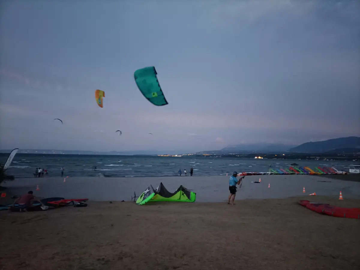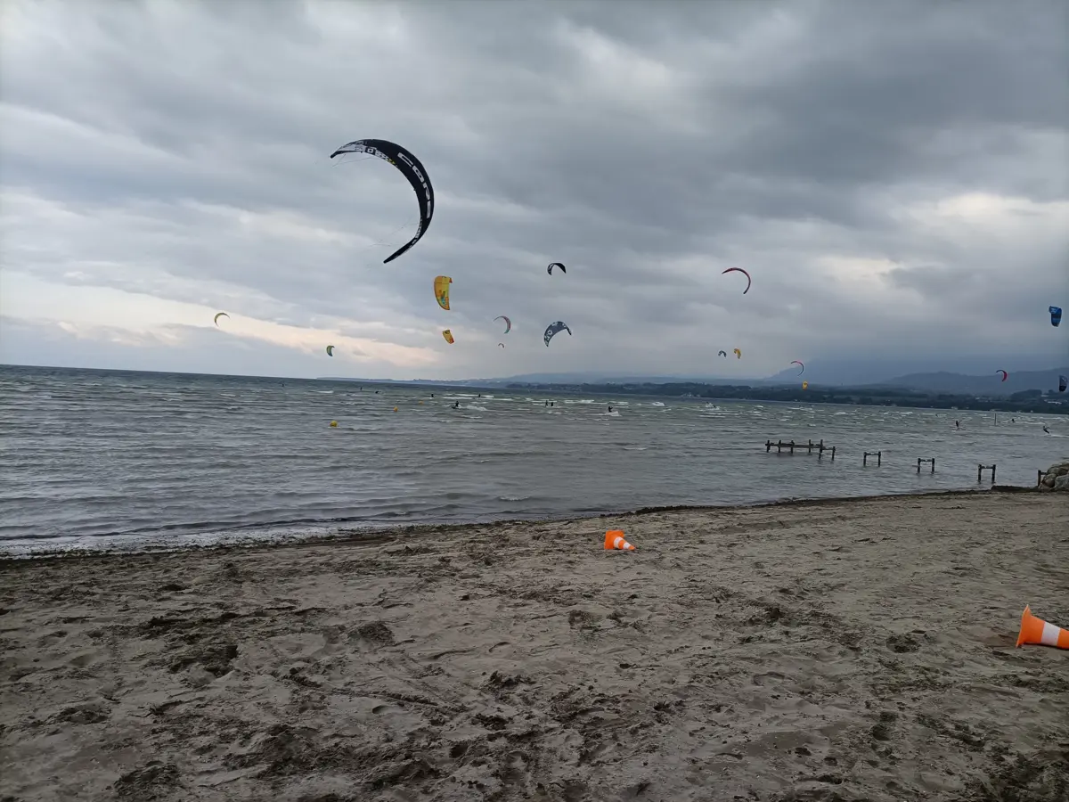 Navigation ouverte (kitesurf et windsurf) seulement si la kite zone est en place (cônes orange et blanc).